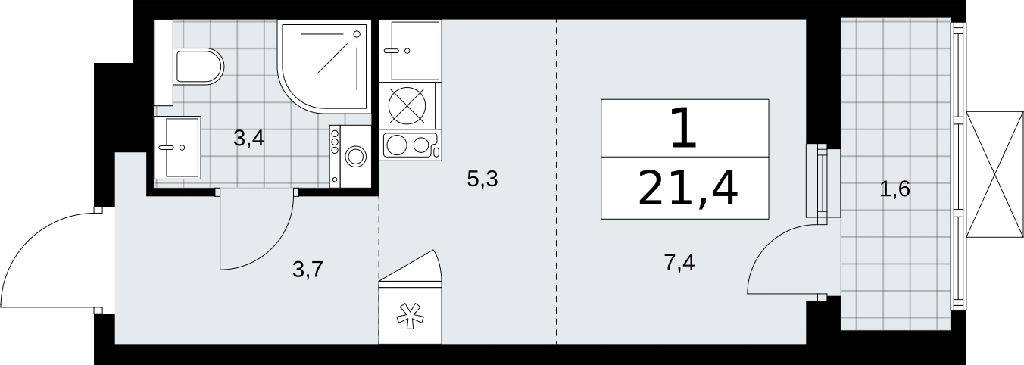Продаю 1-комн. квартиру-студию площадью 21.4 кв.м., без отделки, на 11 этаже из 19 в жилом комплексе комфорт-класса "Бунинские кварталы". В квартире изолированные комнаты, а все окна выходят на одну сторону. В квартире один балкон, один совмещенный санузел. Высота потолков 2.8 м.